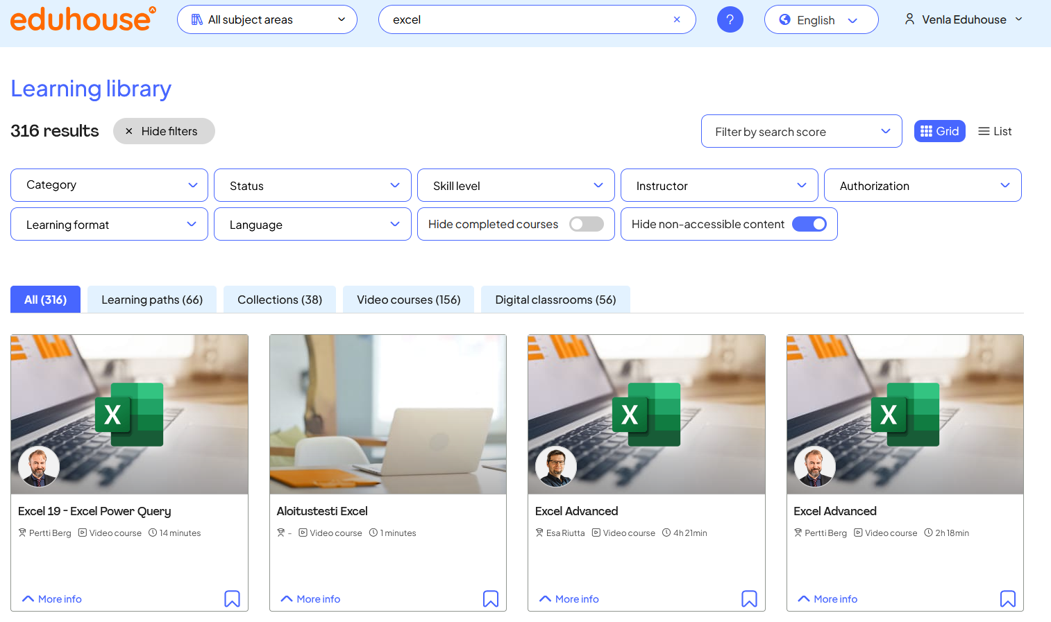 The Eduhouse service offers two ways to find the training content that suits you best. The fastest and easiest option is to use the search box at the top of the page. When you have had time to watch several training courses, the Eduhouse service will also suggest suitable content for you based on your studies and viewing history.