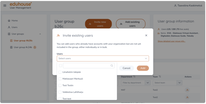 👥➕Kutsu olemassa oleva käyttäjä User groups-näkymässä (Käyttäjäryhmät)