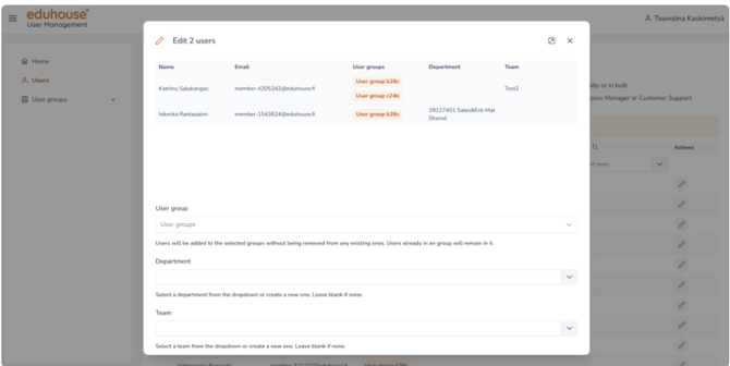 Sähköpostiosoitetta ei voi muuttaa käyttäjähallinnan työkalun kautta teknisistä syistä. Ota yhteyttä Eduhousen asiakastukeen sähköpostin muuttamiseksi.