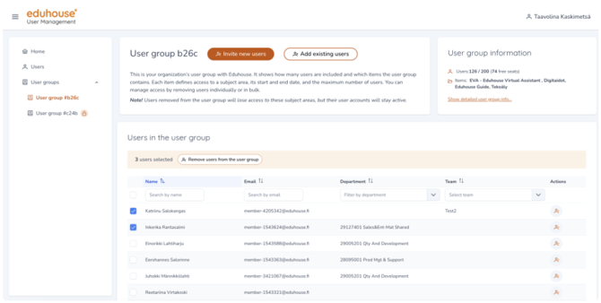 Eduhouse‑palveluun on julkaistu uusi Käyttäjähallinnan työkalu, jonka avulla käyttäjien hallinta on entistä sujuvampaa. Sen avulla voit lisätä uusia käyttäjiä, päivittää käyttäjätietoja  sekä lisätä ja poistaa käyttäjiä sopimuksilta.