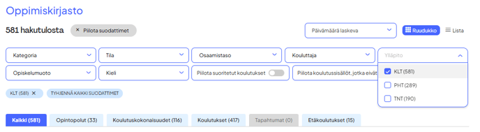 KLT ylläpitotunteja kerryttävät koulutukset löydät kätevästi hyödyntämällä suodatinta "Ylläpito". Klikkaa hakusuodattimet aluksi auki "Näytä suodattimet" painikkeesta ja valitse sitten Ylläpito suodattimesta "KLT".
