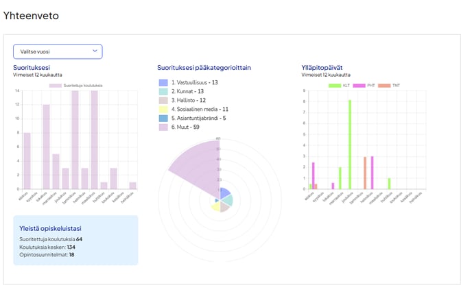 Suoritusrekisterillä näkyy suorittamasi KLT ylläpitokoulutukset sekä täysien KLT ylläpitopäivien kertymä.
