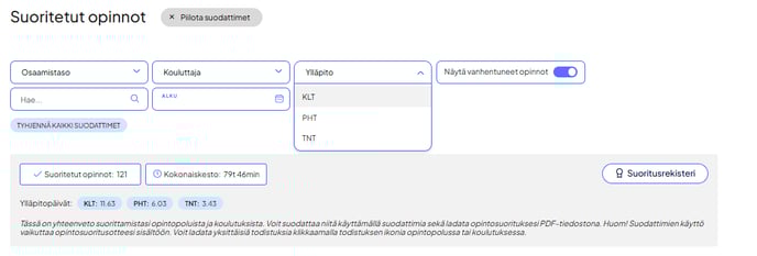 Jotta saat suoritusrekisterille näkyviin KLT ylläpitotuntien kertymän, hyödynnä suodatinta "Ylläpito" ja valitse sen alta vaihtoehto "KLT".