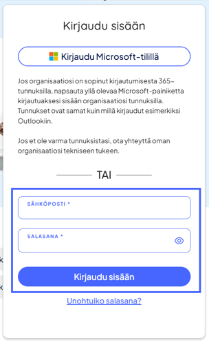 Kun molemmat kentät on täytetty, valitse Kirjaudu sisään jatkaaksesi palveluun.