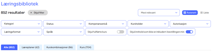 Når dette er på, viser søkeresultatene kun kurs du faktisk har tilgang til. Ønsker du å se hele kursutvalget, inkludert kurs utenfor lisensen din, kan du enkelt skru av filteret.